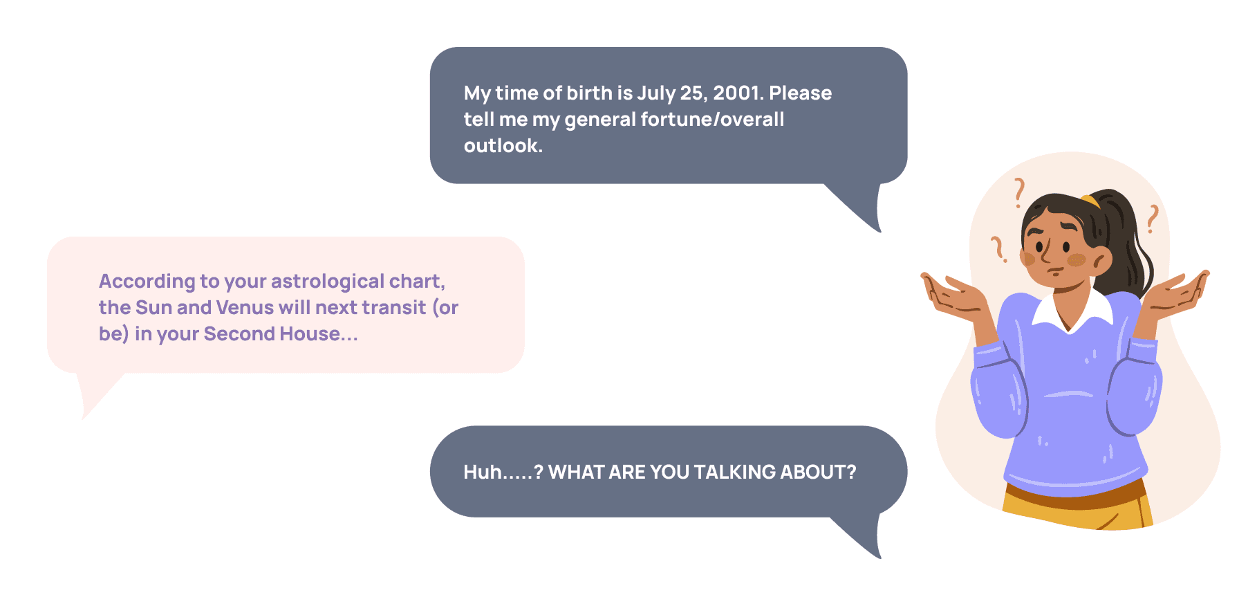 As the dialog box illustrates, users lack understanding of the astrological jargon and its implications. Crucially, the response also failed to provide emotional comfort. Our interviews found that over 60% of all users—and over 85% of users new to astrology—felt the answers were too empty and incomprehensible.